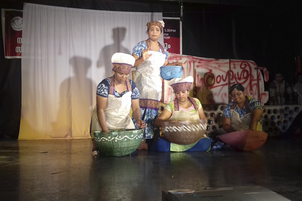 Nireeksha held a series of theatre workshops with women from Kudumbasree, the largest women collective in Asia. Through this process, Nireeksha conceived the concept of community theatre of these women. The idea was to form all -women theatre groups of women that can produce and perform plays that highlight gender issues while incorporating local art forms, language/dialect, stories/myths in that region. With this concept, a team from Nireeksha trained selected women in all aspects of theatre enabling them to form all women theatre groups in five districts of Kerala. Rangasree Community theatre-the generic name for such groups with women from Kudumbasree, has now spread to all districts in the State.